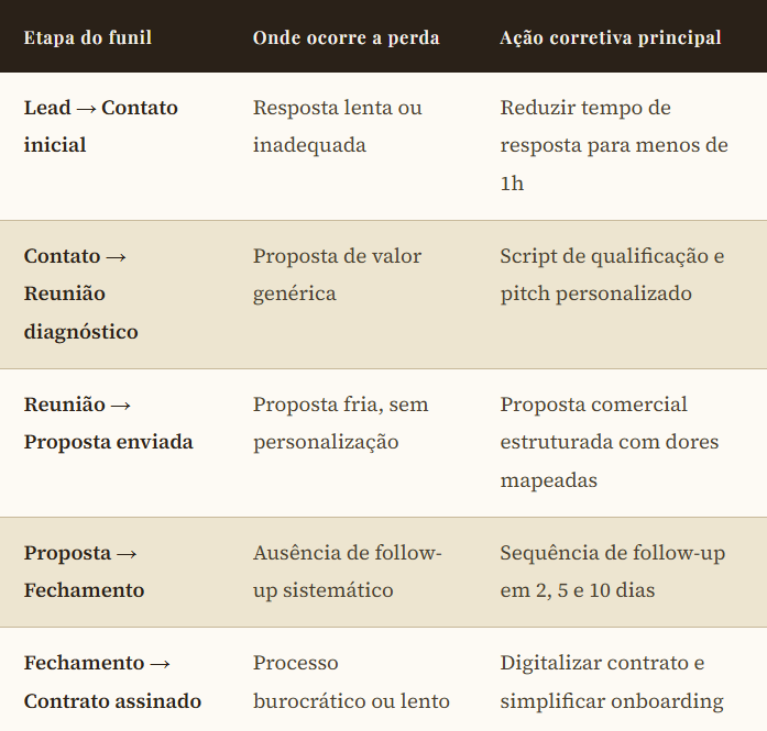 Muitas empresas investem em marketing, geram leads, fazem reuniões de diagnóstico — e convertem uma fração pequena desse esforço em receita. Antes de gastar mais para gerar mais leads, vale a pena perguntar: qual é a taxa de conversão atual? E, mais importante: onde o funil está vazando?